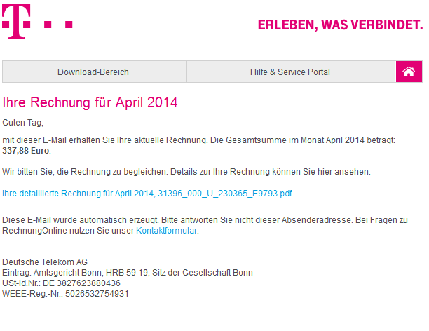 Náš bezpečnostní tým obdržel informaci o novém spamu, který se tváří jako zpráva zaslaná společností T-Mobile a která uživatele informuje o aktuálním vyúčtování. I když je zpráva psána v němčině, mohla by zákazníky společnosti T-Mobile nebo uživatele, kteří nedávno navštívili Německo, uvést v omyl. Zpráva odkazuje na zazipovaný soubor, v němž je spustitelný soubor, který v současné chvíli detekuje dle virustotal.com pouze 7 antivirových řešení jako hrozbu. Nelze vyloučit, že se podobný spam následně objeví i v české mutaci. Doporučujeme proto uživatelům zvýšenou obezřetnost.