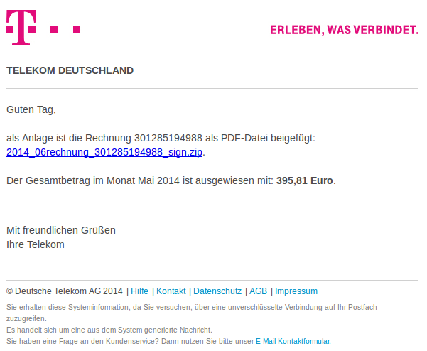 Náš bezpečnostní tým obdržel informaci o další vlně spamu, který se tváří jako zpráva zaslaná společností T-Mobile a která uživatele informuje o aktuálním vyúčtování. I když je zpráva psána v němčině, mohla by zákazníky společnosti T-Mobile nebo uživatele, kteří nedávno navštívili Německo, uvést v omyl. Nedoporučujeme na odkazy v tomto falešném e-mailu klikat.