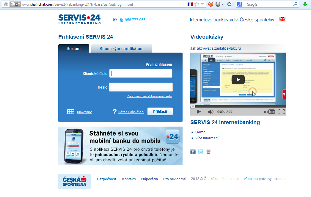 Podvodná webová stránka napodobující skutečné stránky internetového bankovnictví České spořitelny. Po rozkliknutí obrázku je dobře vidět také URL, ze které je jasně patrné, že tyto stránky nemají s Českou spořitelnou nic společného